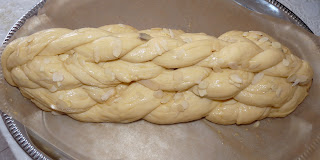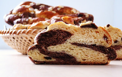 A dáme na plech alebo tácku na ktorom máme už pripravený papier na pečenie a necháme ešte 35-40 min pokysnúť. Pred pečením pomastíme žltkom zmiešaným s 2 lyžicami mlieka, posypeme mandľami (kto nemá rád nemusia byť) a dáme piecť, prvých 5 minút 240°C a potom 30 minut na 170°C A pokiaľ už má farbu a nie je dopečená, prikrijeme alobalom.